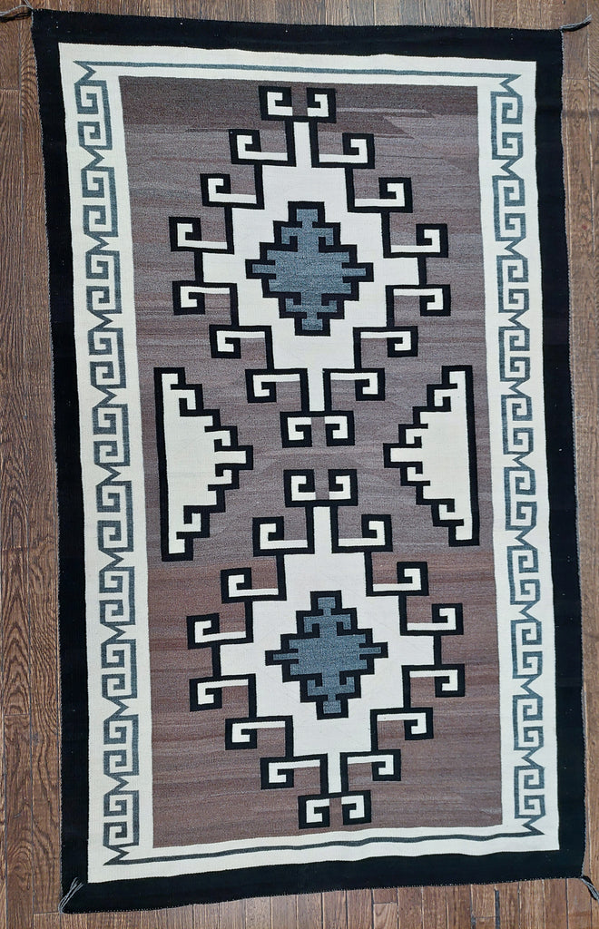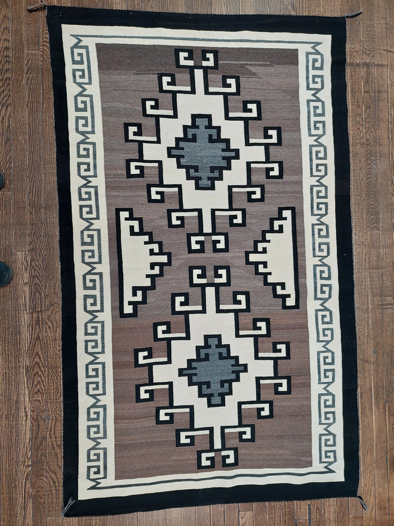 Add warmth and character to your home with our vintage Navajo 2 Grey Hills Rug. Featuring a striking variation of the Greek key in black, brown, cream and gray, this rug adds a touch of southwestern charm to any room. Perfect for creating a cozy and inviting atmosphere.